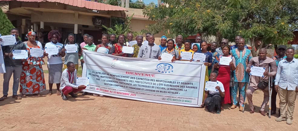 Une session de formation de cinq jours initiée par l’Union togolaise de l’hôtellerie (UT H) à l’endroit de, a pris fin le vendredi 10 novembre à Mango, à l’Hôtel MATOUSH.La formation porte sur « Le leadership participatif, les techniques d’accueil, le marketing, la gestion comptable et financière, et l’hygiène en milieu hôtelier » et a regroupé dans la salle de réunion du prestigieux hôtel MATOUSH vingt-quatre gérants d’hôtels et de restaurants du grand Oti.