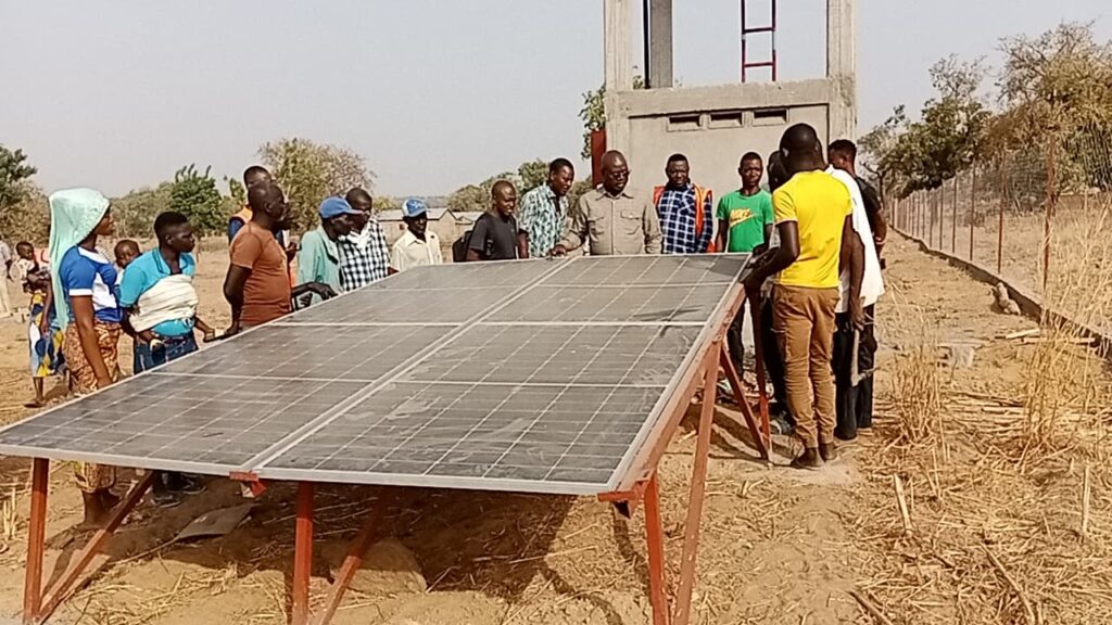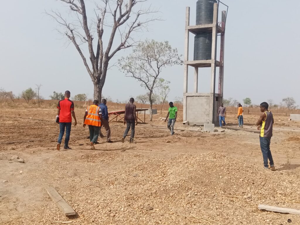 Chaque site, d’une superficie d’un hectare, a été entièrement clôturé avec un grillage renforcé de fils barbelés pour protéger les cultures. Un forage alimenté par des panneaux photovoltaïques assure l’approvisionnement en eau, avec une capacité de stockage de 10 m³. De plus, trois bacs de stockage supplémentaires de 6 m³ chacun ont été construits pour renforcer cette capacité. Dans une démarche inclusive, un système d’irrigation automatique utilisant des bandes perforées a été installé sur un quart de la superficie de chaque site, facilitant ainsi l’accès à l’agriculture pour les personnes handicapées.