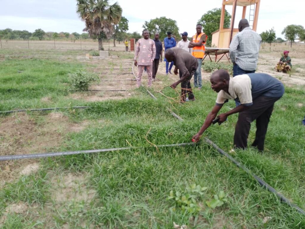 Les sites s’étendent sur une superficie d’un hectare et sont protégés des animaux par des fils barbelés. Chaque site est doté d’un forage d’un débit de 5m3 par heure équipé de deux polytanques d’une capacité de 5m3 également alimenté par des panneaux solaires. Trois banques à eau de 6m3 construites servent à retenir l’eau et un système d’irrigation par bandes perforées permet de distribuer l’eau sur 500m2 de l’espace aménagé…. Grâce à ces champs expérimentaux, les coopératives pourront mener des activités agricoles en toute saison, notamment le maraîchage en saison sèche, et les bénéfices seront utilisés pour développer les coopératives.