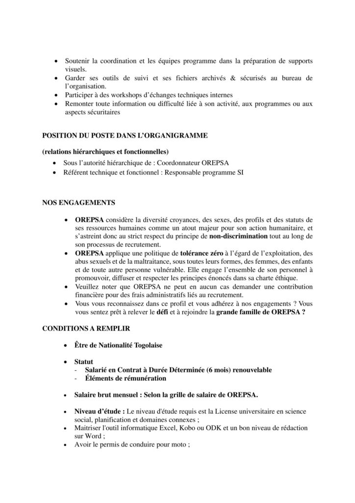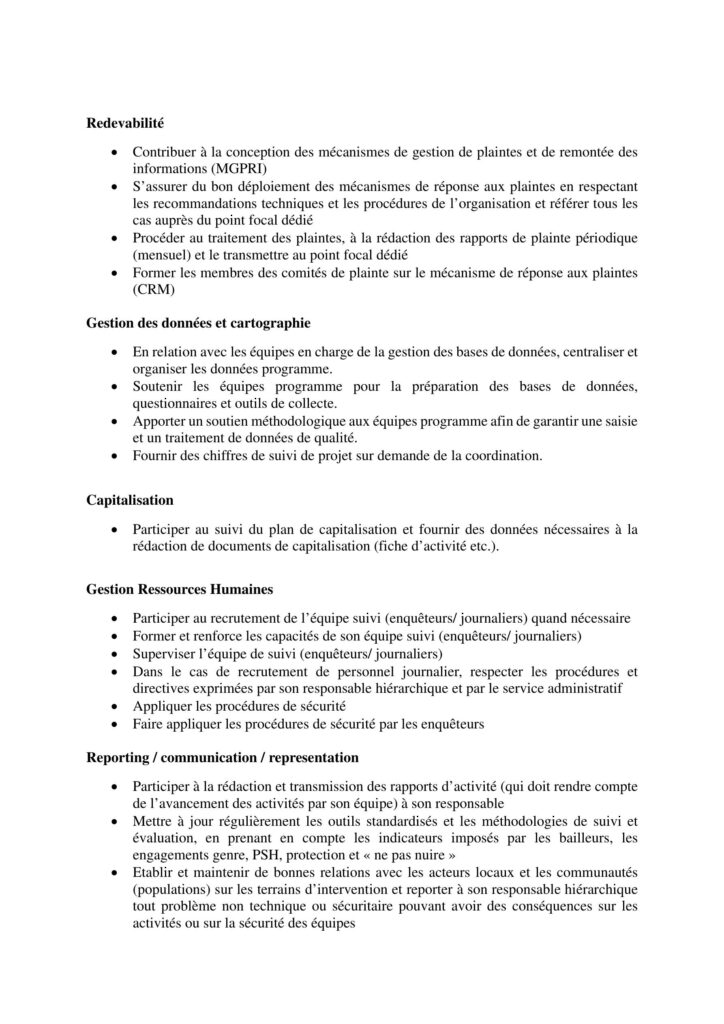 Le/la chargé(e) de suivi-évaluation (S&E) collecte et documente les données, soutient les équipes, assure la formation des enquêteurs et veille au respect des procédures organisationnelles.