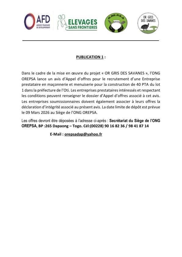 Avis d’appel d’offres pour le recrutement d’entreprise prestataire